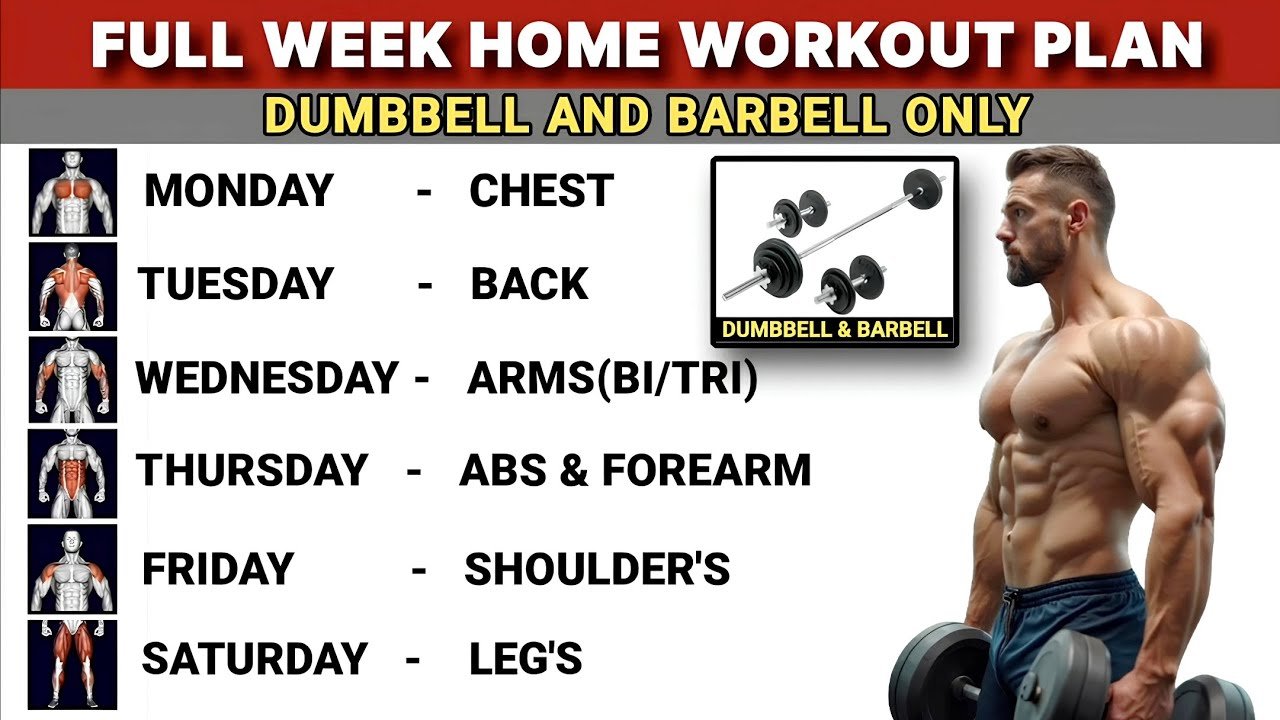 Full Week Home Workout Plan With Dumbbells & Barbell | Symmetrical Development | No Gym Required | by admin November 17, 2025 32 Check on YouTube exercise plan for a week FacebookTwitterPinterestEmail You may also like Daily Home Workout for Beginners — No Equipment... March 3, 2026 15 Min Flat Belly Workout For Seniors Over... March 2, 2026 Beginners gym workout tips 🤩 இத பண்ணுங்க போதும்... March 1, 2026 4 Step Guide To Create The Workout Routine... February 28, 2026 Learn to Program for Strength in 5 Simple... February 27, 2026 Easy 15-min workout to Reduce Belly Fat |... February 26, 2026 November Diet Plan to Lose Weight | 80g... February 25, 2026 10 Minute Gentle Fibromyalgia Exercise for Home February 24, 2026 Standing Pilates for Ages 60+: Improve Strength &... February 23, 2026 Beginner’s Gym Guide | Full Workout Plan &... February 22, 2026